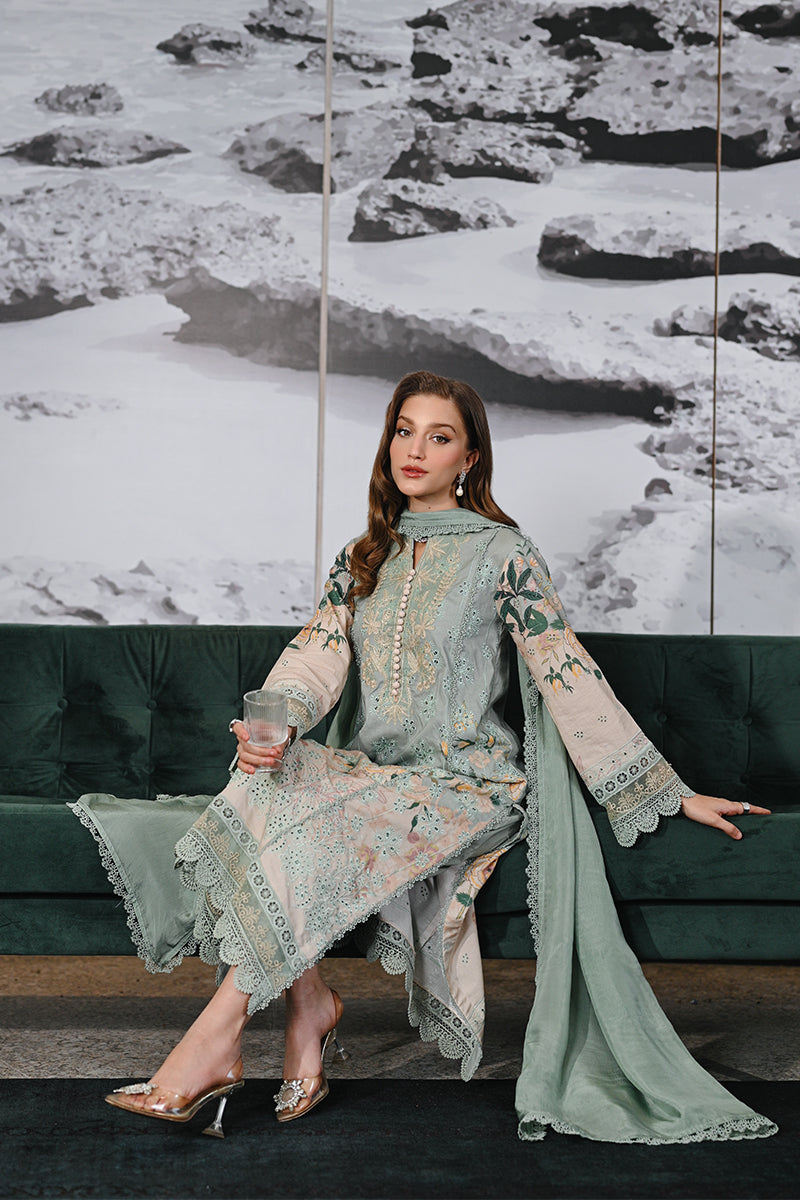 A captivating green printed A-line shirt with delicate hints of yellow, adorned with exquisite embroidered organza borders and lace detailing. Paired with a luxurious silk dupatta and Izaar pants, both featuring elegant lace borders, this ensemble effortlessly blends modern sophistication with timeless charm.