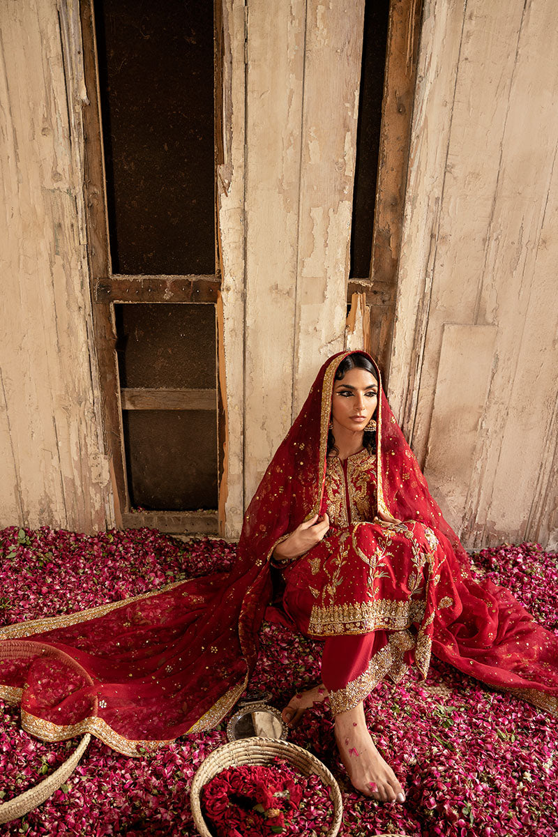 Command Attention in Regal Red. This Raw Silk ensemble ignites a fire of sophistication. The meticulously crafted shirt boasts intricate handwork, where shimmering dabka stones and sequins dance across the luxurious rawsilk. A mesmerizing net organza kaamdani dupatta drapes effortlessly, while the refined Raw Silk izaar completes the masterpiece. This ensemble transports you and your presence into a realm of pure enchantment. Own the night, one captivating step at a time.