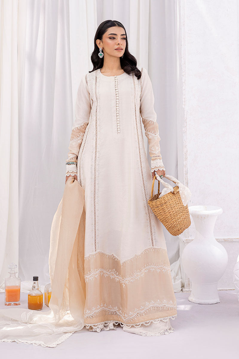 Ivory A-line kurta crafted in a printed base featuring repetitive gold motifs across the entire silhouette. The neckline is adorned with embellished detailing that includes sequins and beadwork. The sleeves and daman are finished with intricate borders showcasing multicolor thread embroidery in red and green, with gold zari accents. The kurta is paired with straight ivory pants featuring delicate scalloped embroidery on the hem. The ensemble is completed with an ivory medium silk dupatta, decorated with small bootis and an embroidered border that mirrors the kurta’s daman detailing.